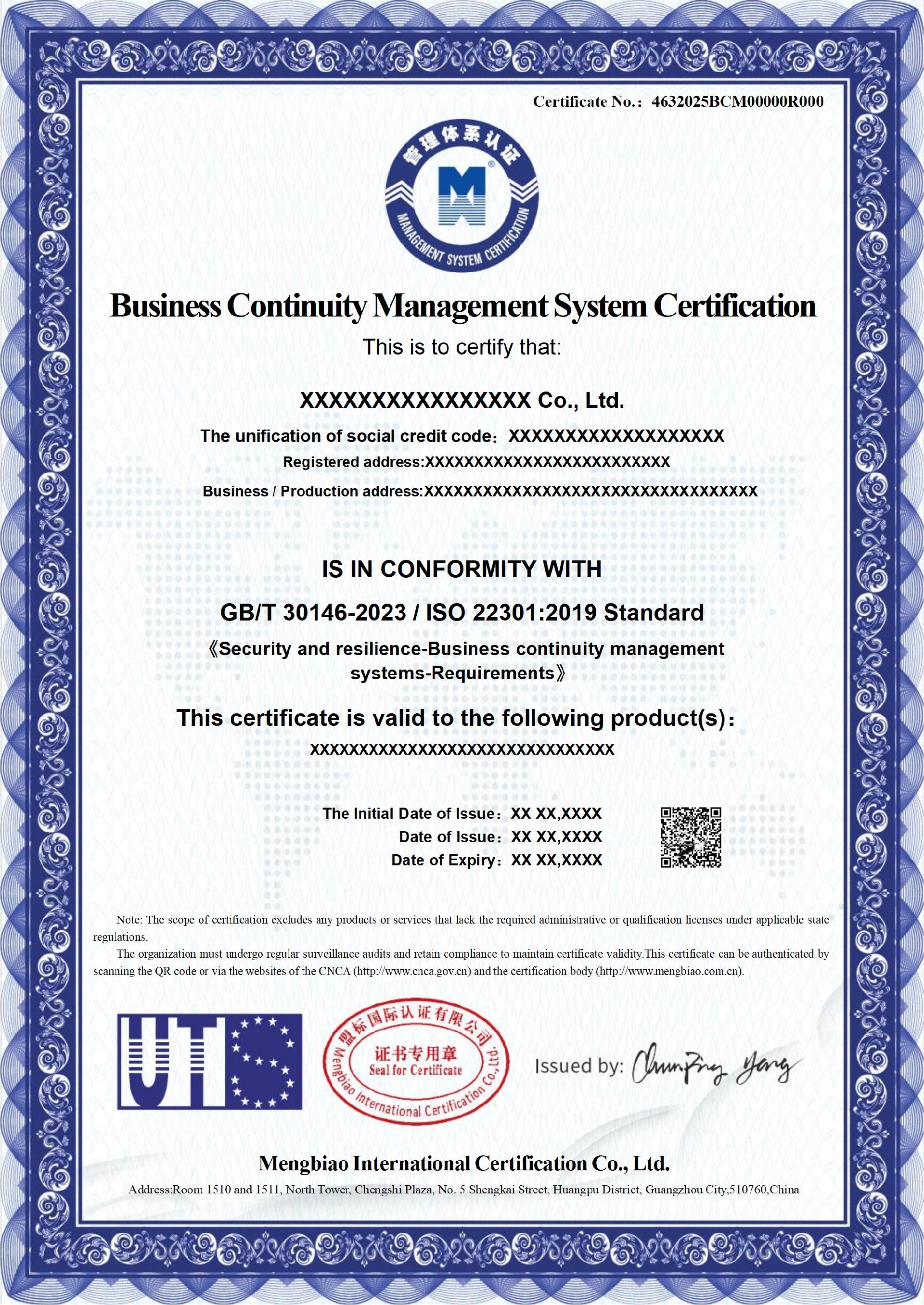 業(yè)務(wù)連續(xù)性管理體系認(rèn)證證書(shū)-中文版