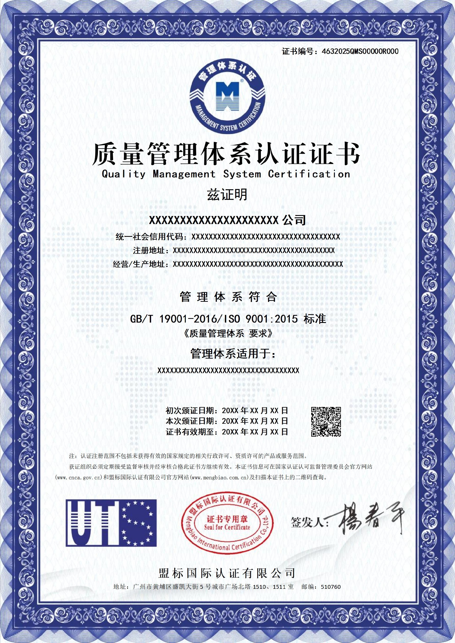 質(zhì)量管理體系認(rèn)證證書(QMS)-樣版