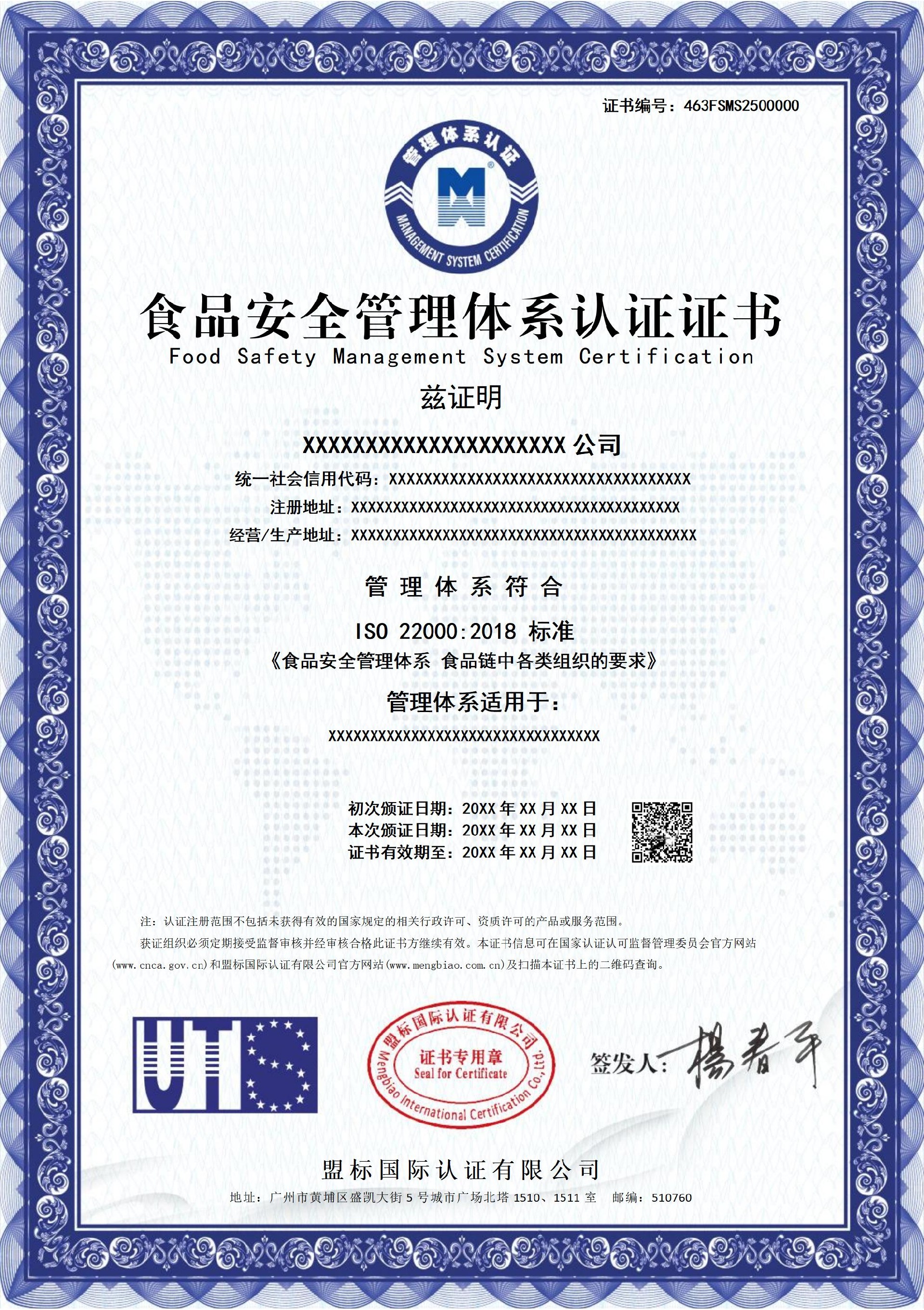 食品安全管理體系認(rèn)證證書-樣版
