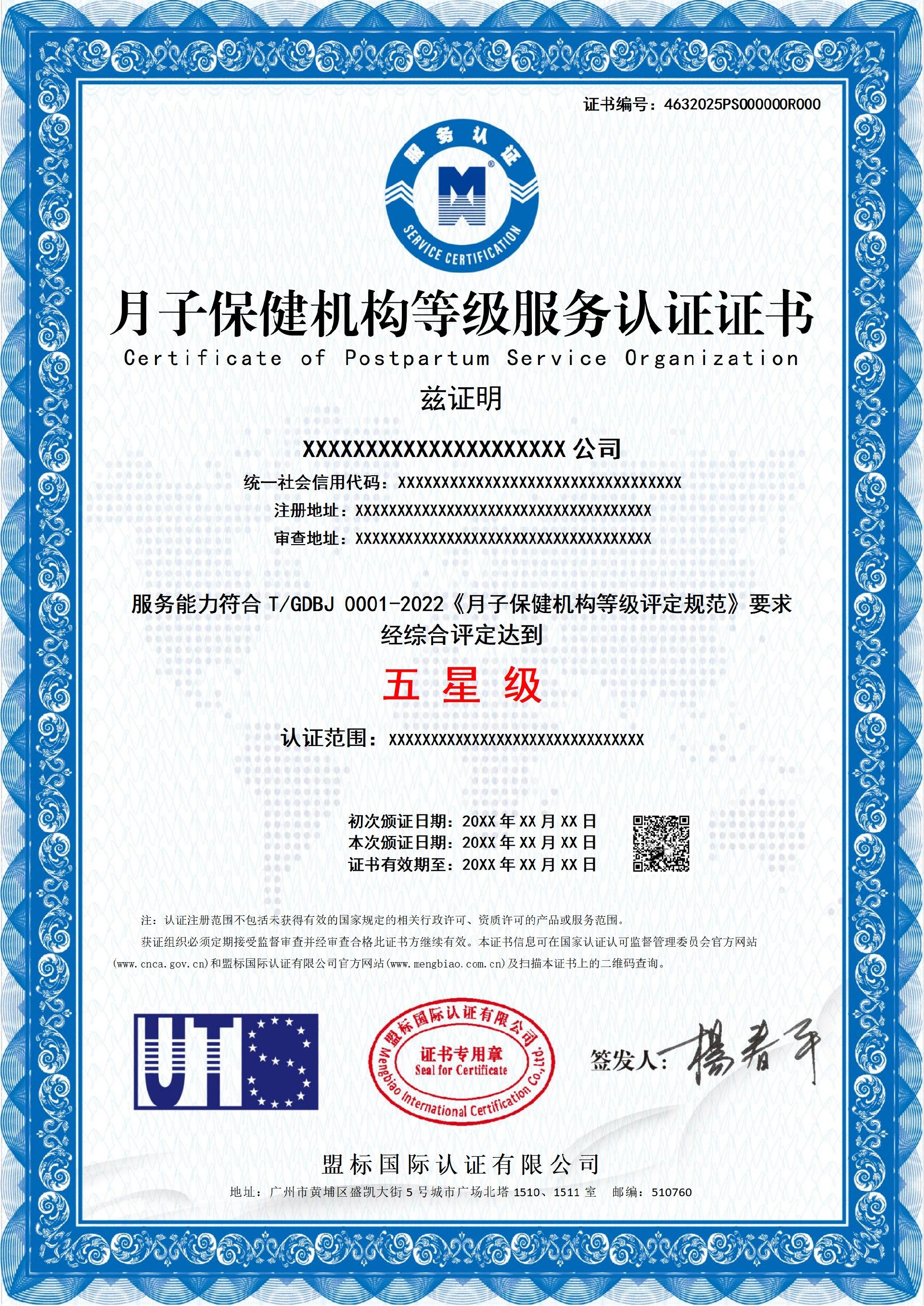 月子保健機構等級服務認證證書-樣版