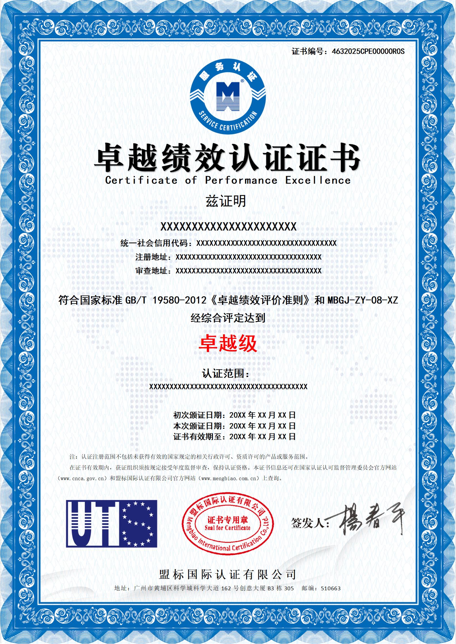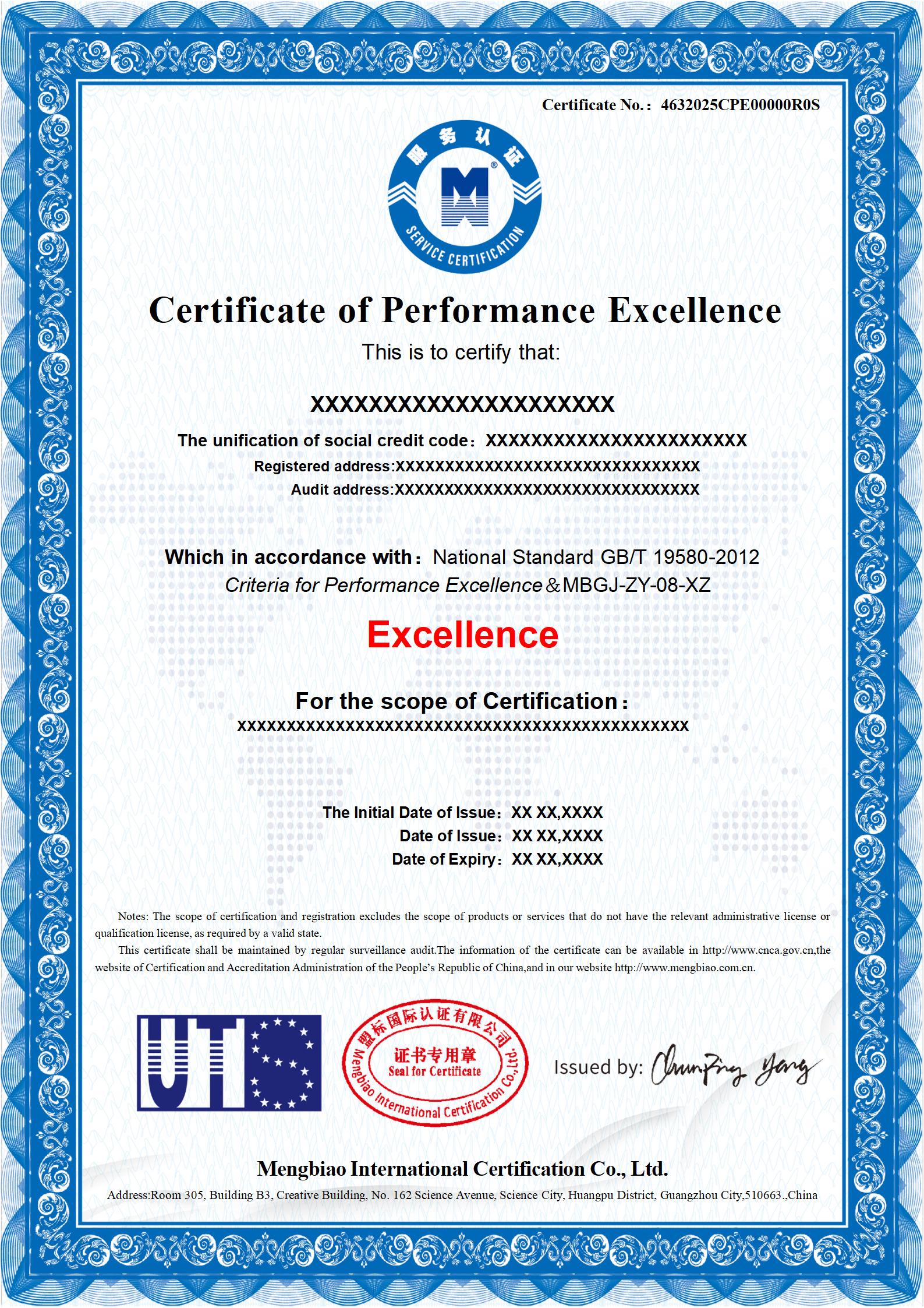 卓越績(jī)效認(rèn)證證書(shū)——中文版證書(shū)