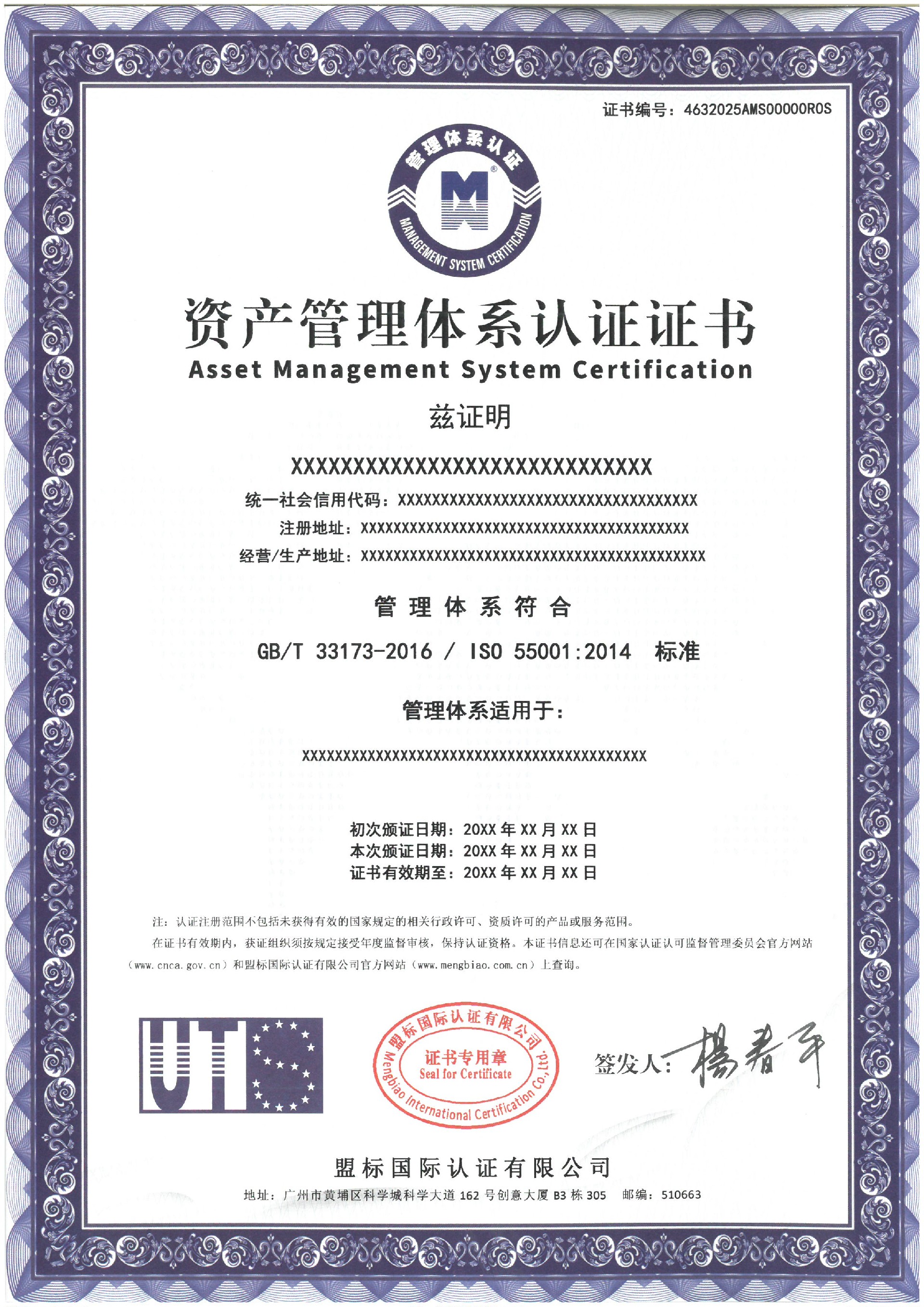 資產(chǎn)管理體系認(rèn)證證書-樣版