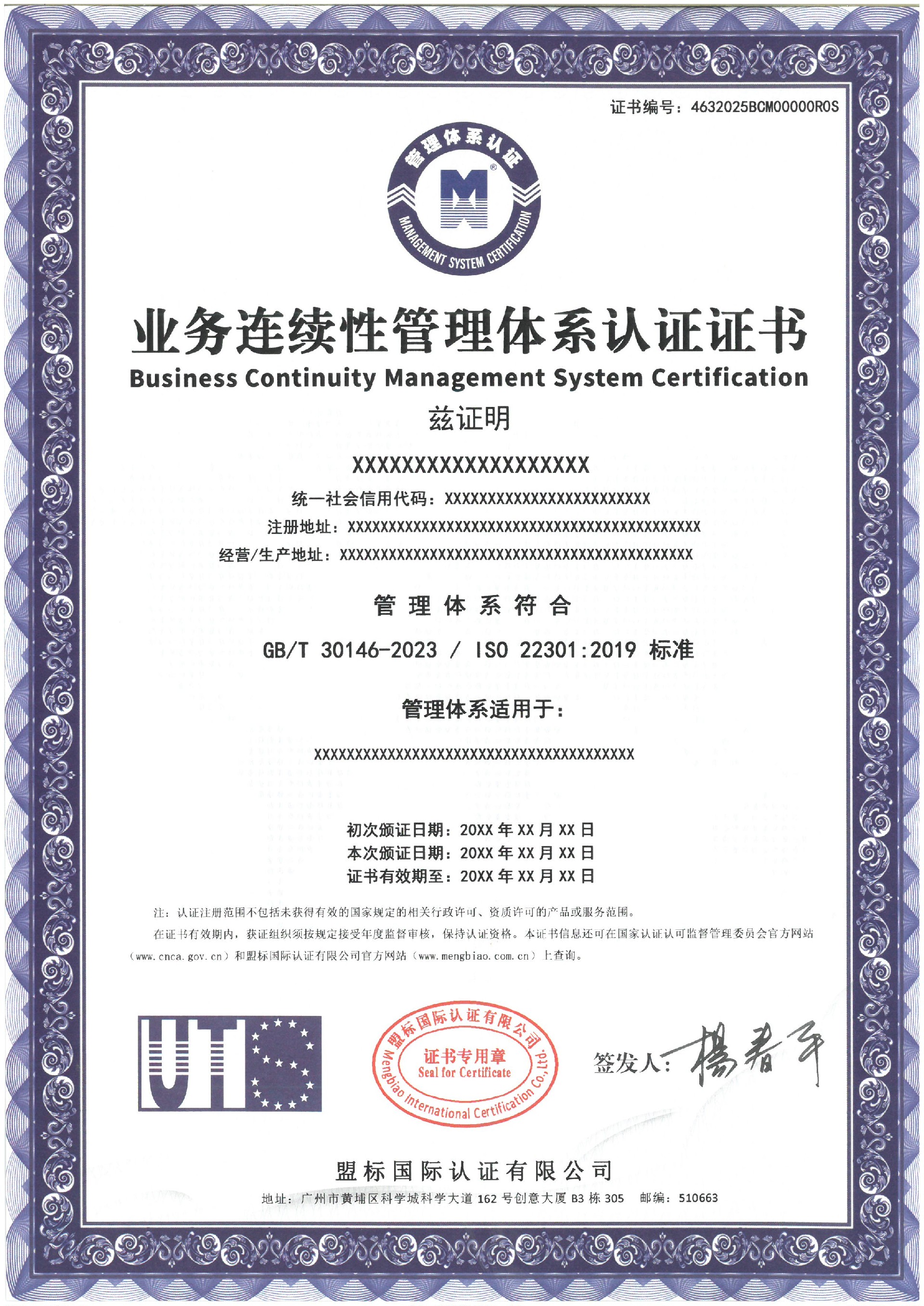 業(yè)務(wù)連續(xù)性管理體系認(rèn)證證書-樣版