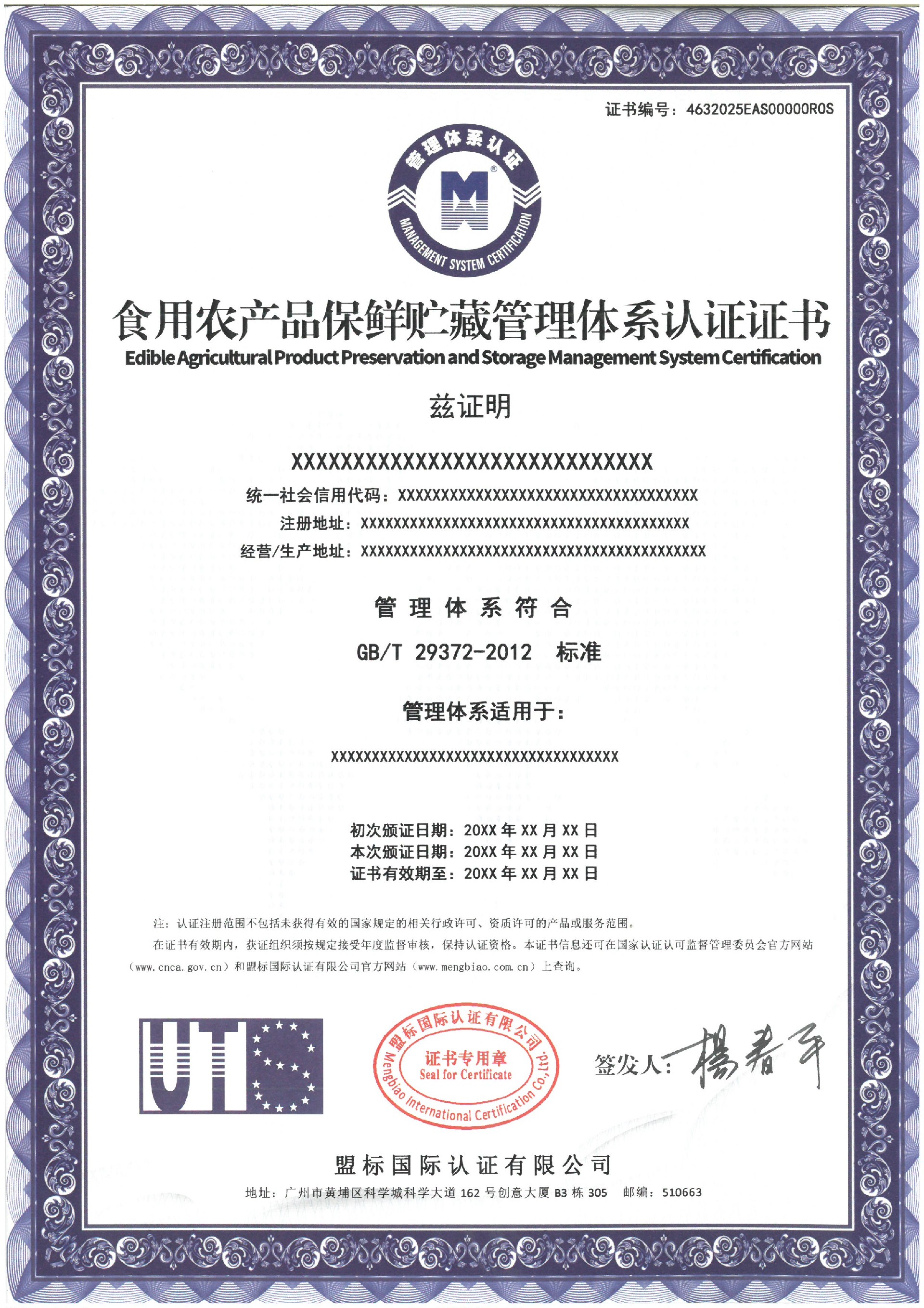 食用農(nóng)產(chǎn)品保鮮貯藏管理體系認(rèn)證證書-樣板