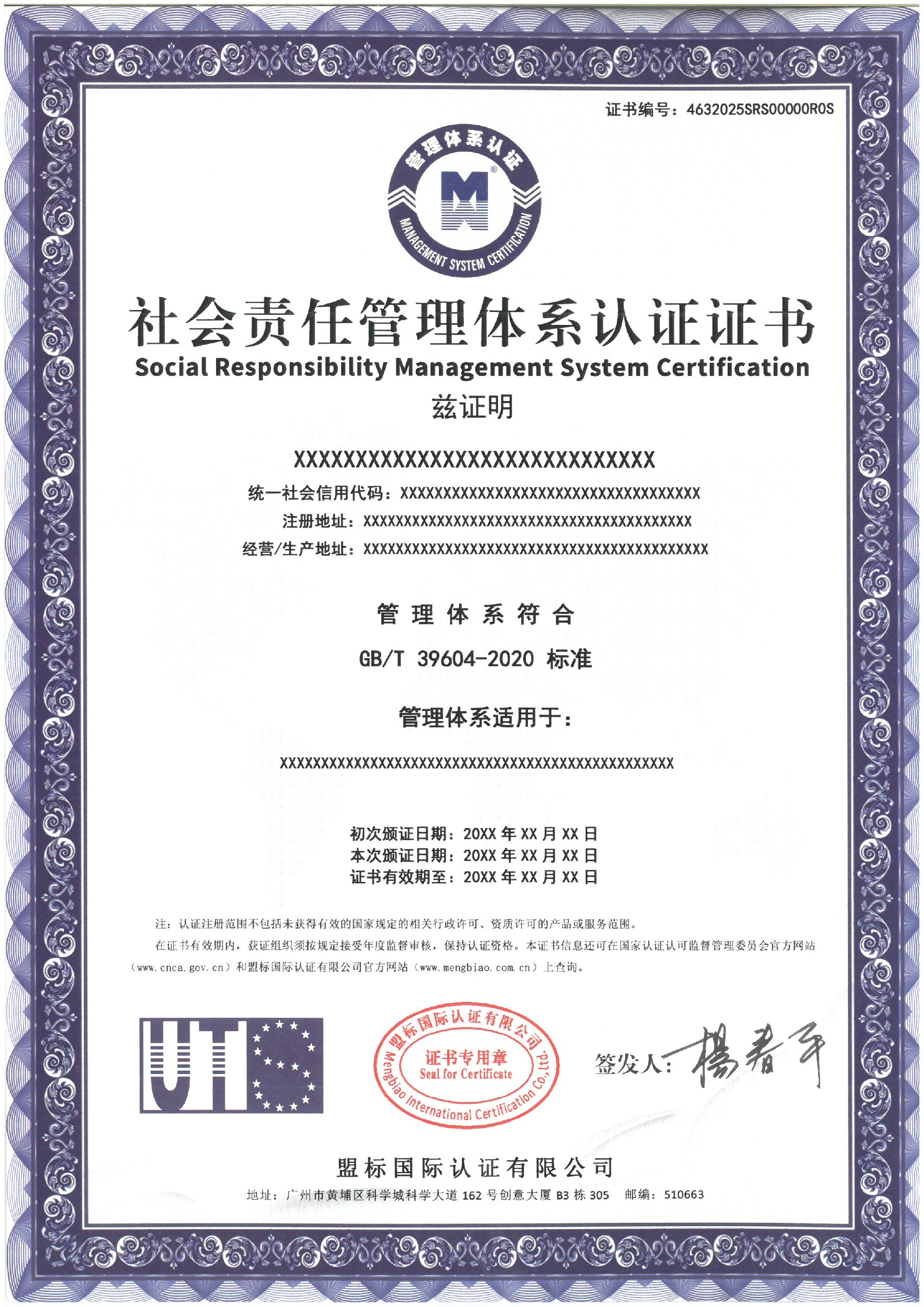 社會(huì)責(zé)任管理體系認(rèn)證證書-樣板