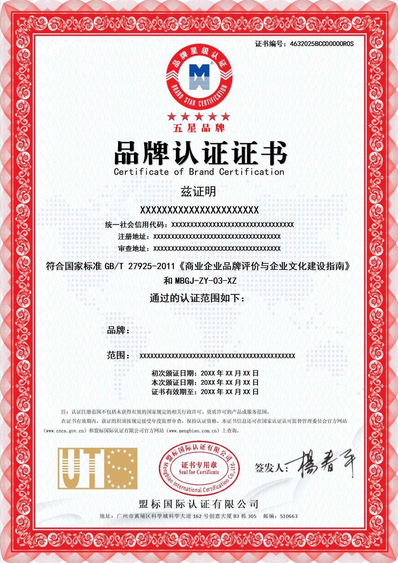 品牌認(rèn)證證書-樣版