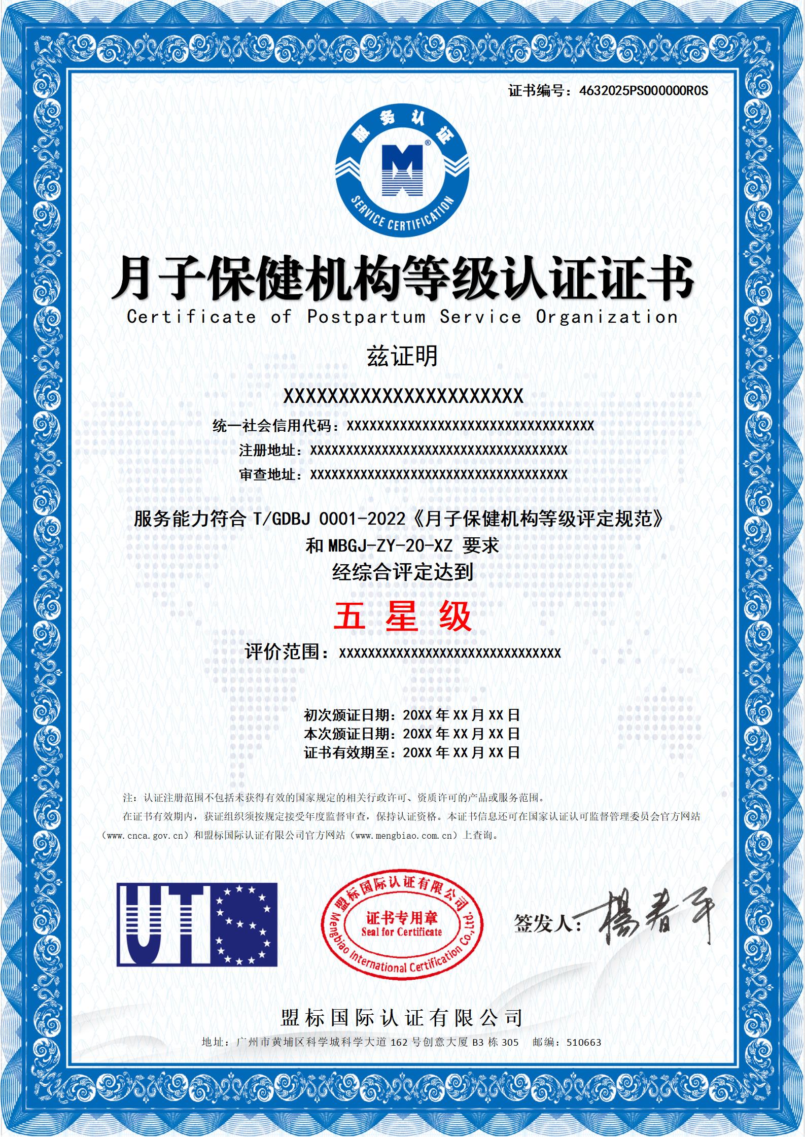 月子保健機構(gòu)等級認證證書-樣版